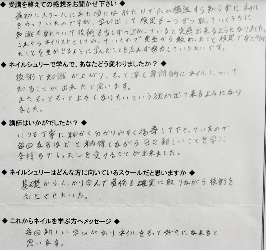 ネイルシュリーでは、とっても大切な基礎を沢山学ばせていただき、夢だった独立開業も叶いました。